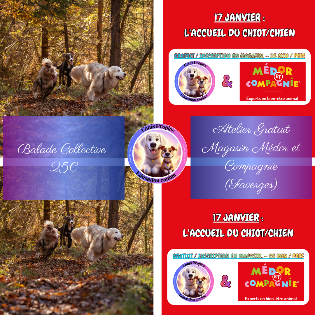 Les balades collectives et éducatives permettent de socialiser vos chiens entre eux, et de sensibiliser les propriétaires de chiens sur le langage canin, en observant et décryptant les interactions entre chiens. Les balades durent entre 1h30 et 2h en extérieur (campagne, forêt, montagne). Elles seront proposées deux fois par semaine et se feront à partir de 3 chiens, jusqu’à 6 maximum. Pour les nouveaux clients, une rencontre préalable (payante) est obligatoire avant d’insérer le chien dans un groupe. Cela permet de mieux cibler les attentes du maître et d’apprendre à connaitre le chien afin de proposer les balades les plus adaptées. Enfin ce sera l’occasion de prendre une collation ensemble !