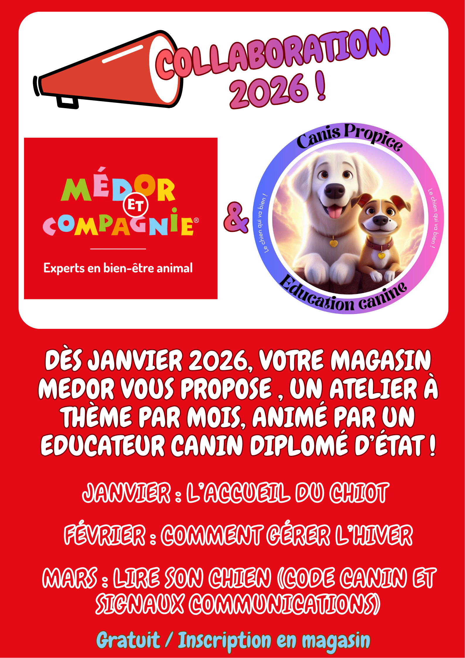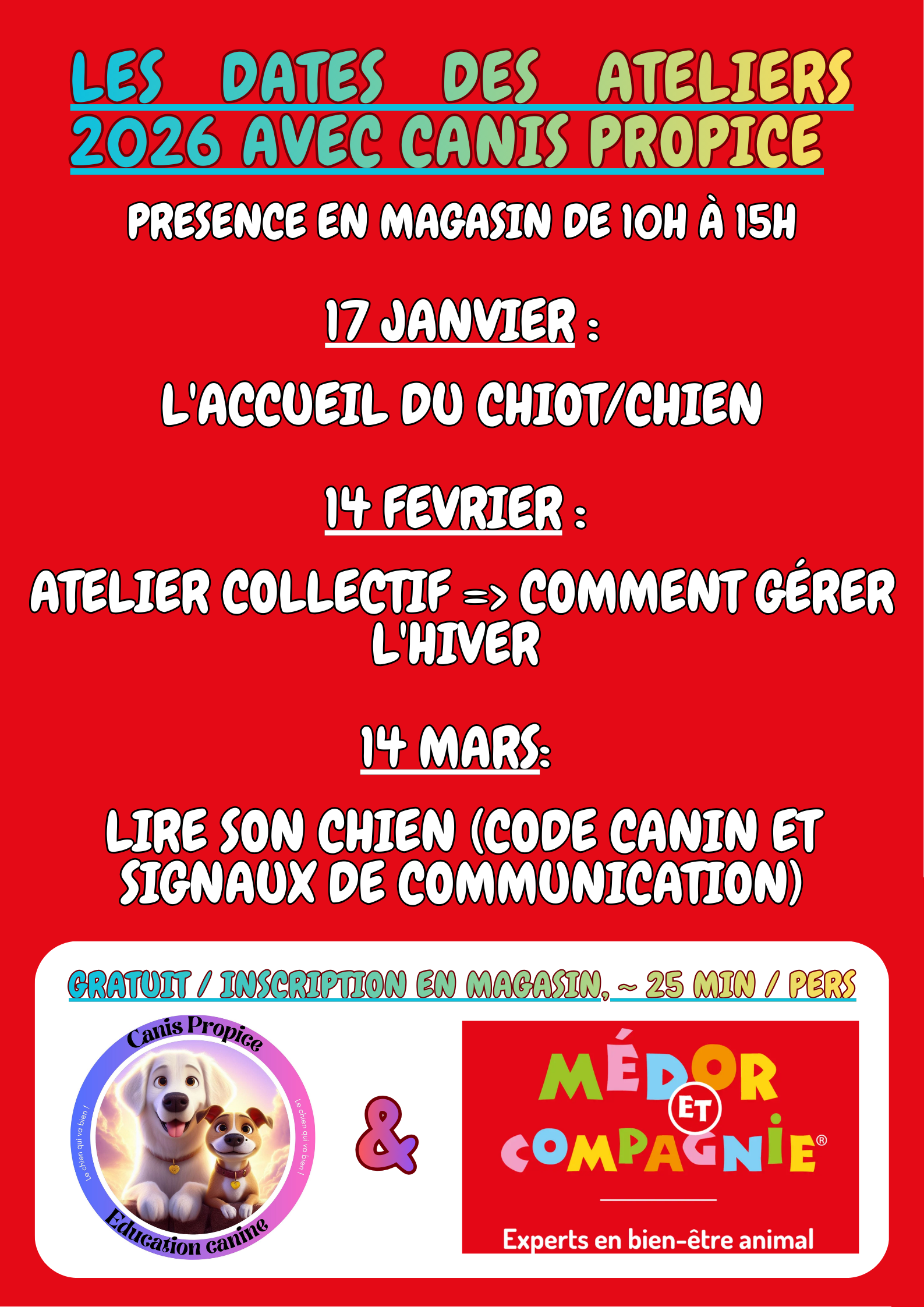 Toutes races, toutes tailles. A partir de 10 mois, sauf balades dédiées. Inscription obligatoire. Retrouvez les dates et thèmes sur l’accueil ou sur les réseaux sociaux.