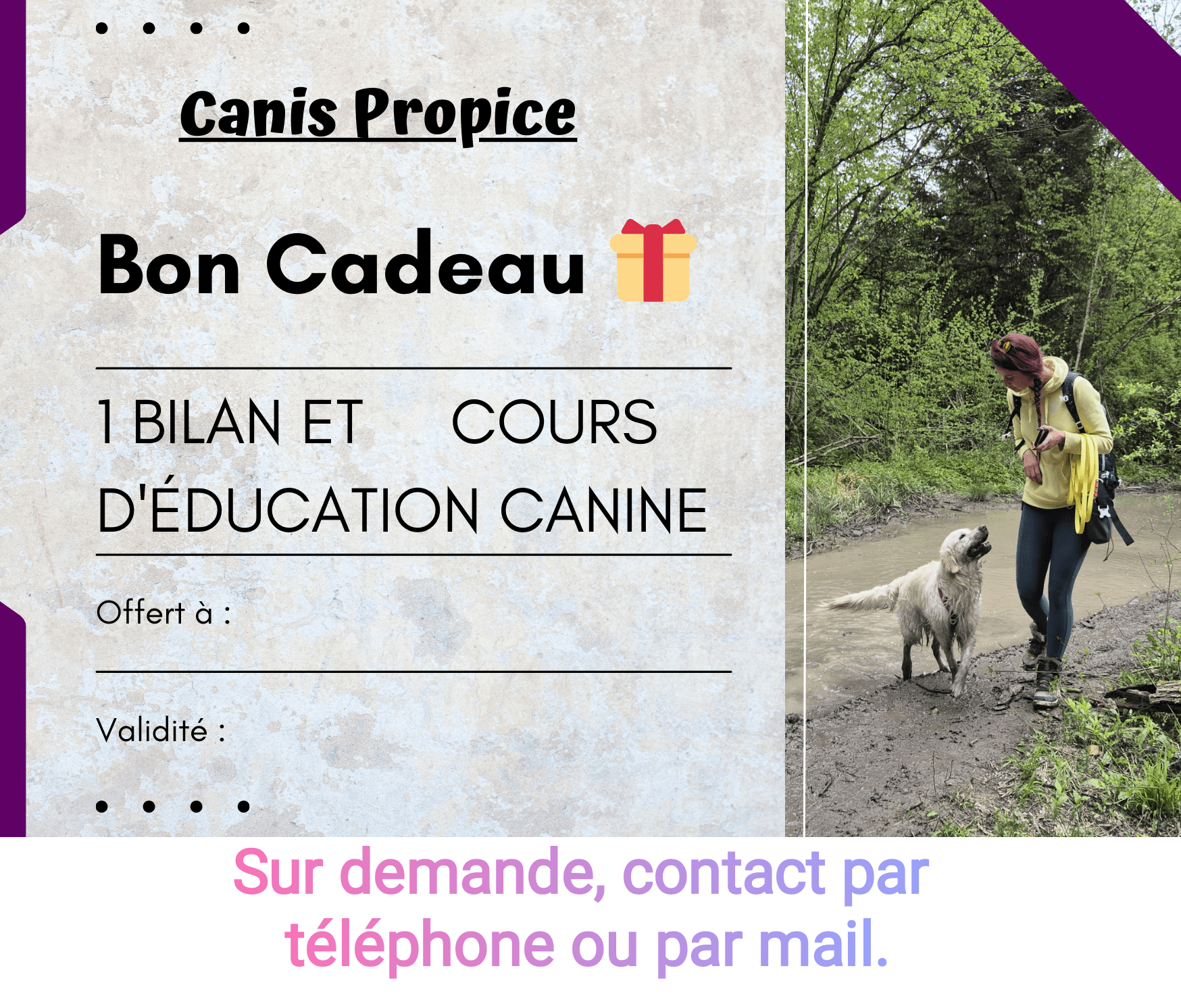 Canis Propice vous propose également des services de balades et de compagnie à domicile (avec éducation, jeux, câlin, nourrissage, soin si besoin) lorsque les propriétaires des chiens sont absents : journée de travail, weekend. Le nombre et la durée de passage sont convenues avec les propriétaires en fonction de leurs besoins. Pour les nouveaux clients, une rencontre préalable (payante) est obligatoire avant le début de la collaboration. Cela permet de mieux cibler les attentes du maître et d’apprendre à connaitre le chien afin de proposer les activités les plus adaptées.